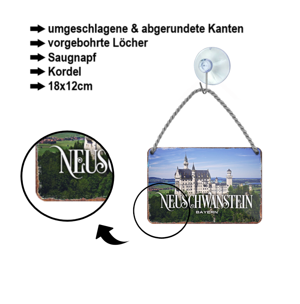 Das Blechschild ''Neuschwanstein'' ist aus einem qualitativ hochwertigen Blech mit abgerundeten und umgeschlagenen Kanten. Ideal für Liebhaber und Fans von ''Reisen, Erlebnissen und Sehenswürdigkeiten'' und definitiv ein Hingucker für jedermanns Auge.