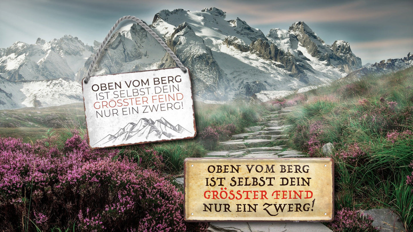 Das Blechschild ''Oben vom Berg ist selbst Feind Zwerg'' ist aus einem qualitativ hochwertigen Blech mit abgerundeten und umgeschlagenen Kanten. Ideal für Liebhaber und Fans von „Bergen und Wandern“ und definitiv ein Hingucker für jedermanns Auge.