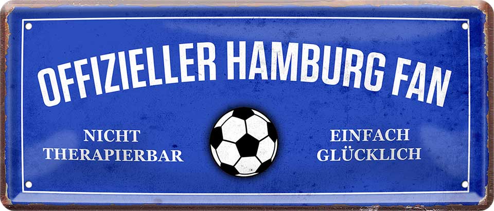 Das Blechschild ''Offizieller Hamburg Fan'' ist aus einem qualitativ hochwertigen Blech mit abgerundeten und umgeschlagenen Kanten. Ideal für Liebhaber und Fans von "Fußball und Vereinen" und definitiv ein Hingucker für jedermanns Auge.