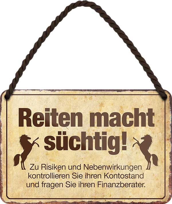 Blechschild ''Reiten macht süchtig. zu Risiken und Nebenwirkungen'' 18x12cm