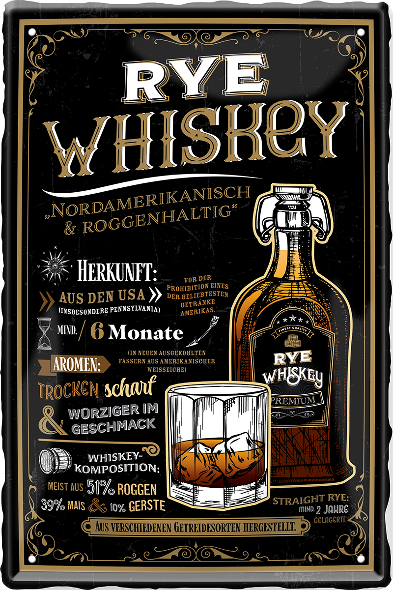 Blechschild ''Rye Whiskey (Bügelverschluss)'' 20x30cm