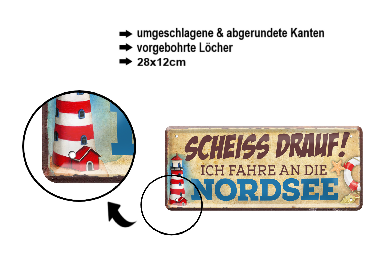 Das Blechschild ''Scheiss drauf! Ich fahre an die Nordsee'' ist aus einem qualitativ hochwertigen Blech mit abgerundeten und umgeschlagenen Kanten. Ideal für Liebhaber und Fans von ''frischer Meeresluft und Stränden'' und definitiv ein Hingucker für jedermanns Auge.