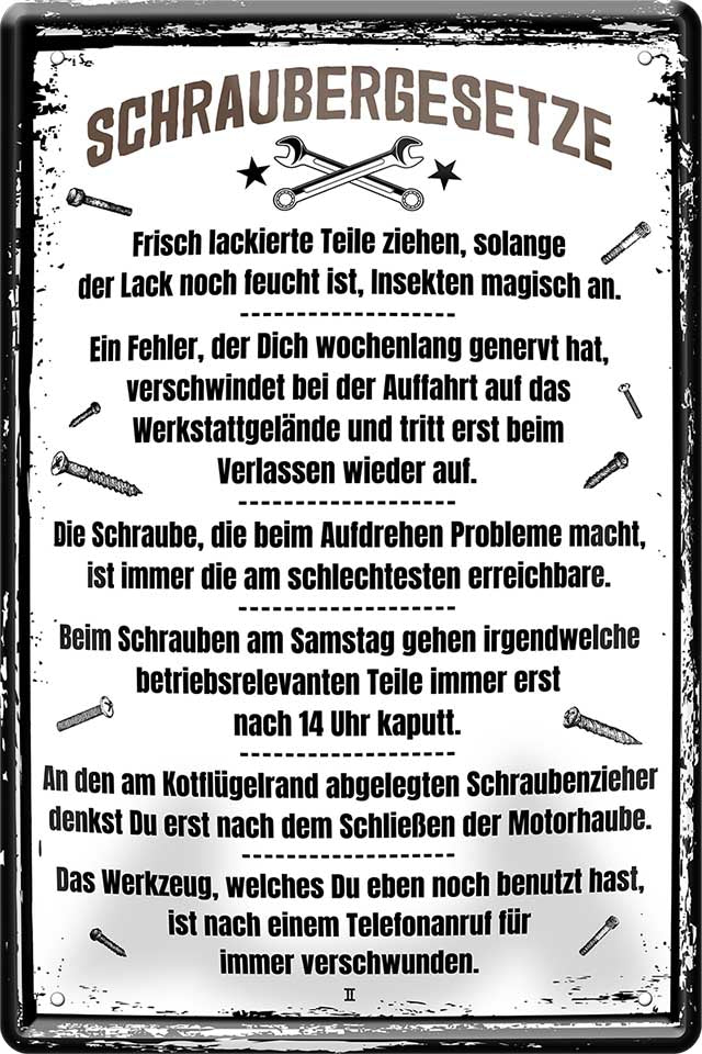 Das Blechschild ''Schraubergesetze. Frisch lackierte Teile ziehen Insekten an'' ist aus einem qualitativ hochwertigen Blech mit abgerundeten und umgeschlagenen Kanten. Ideal für Liebhaber und Fans von ''Motoren und Geschwindigkeit'' und definitiv ein Hingucker für jedermanns Auge.