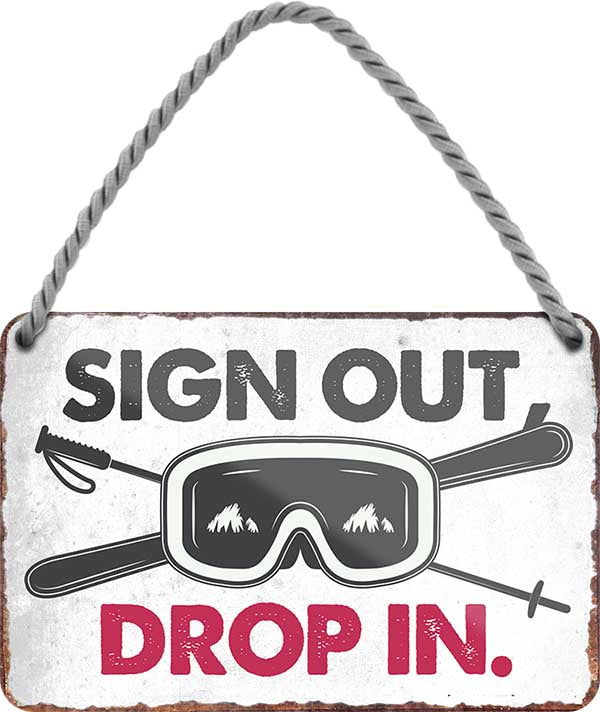 Das Blechschild ''Sign out drop in'' ist aus einem qualitativ hochwertigen Blech mit abgerundeten und umgeschlagenen Kanten. Ideal für Liebhaber und Fans von ''ironischem und sarkastischem Humor'' und definitiv ein Hingucker für jedermanns Auge.