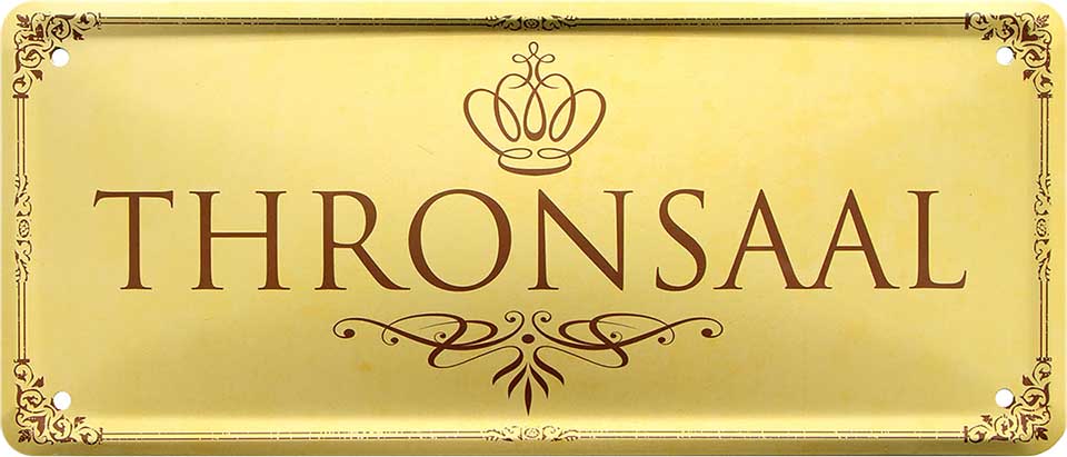 Das Blechschild ''Thronsaal'' ist aus einem qualitativ hochwertigen Blech mit abgerundeten und umgeschlagenen Kanten. Ideal für Liebhaber und Fans von ''ironischem und sarkastischem Humor'' und definitiv ein Hingucker für jedermanns Auge.