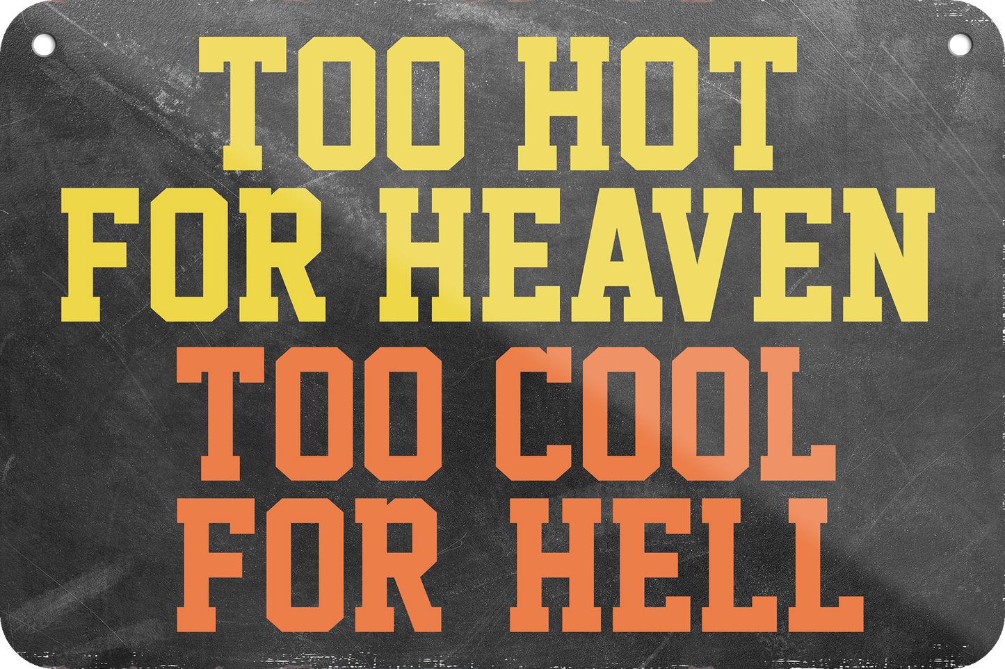 Das Blechschild ''Too hot for heaven too cool for hell'' ist aus einem qualitativ hochwertigen Blech mit abgerundeten und umgeschlagenen Kanten. Ideal für Liebhaber und Fans von ''ironischem und sarkastischem Humor'' und definitiv ein Hingucker für jedermanns Auge.
