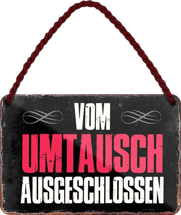 Das Blechschild ''Vom Umtausch ausgeschlossen'' ist aus einem qualitativ hochwertigen Blech mit abgerundeten und umgeschlagenen Kanten. Ideal für Liebhaber und Fans von ''ironischem und sarkastischem Humor'' und definitiv ein Hingucker für jedermanns Auge.