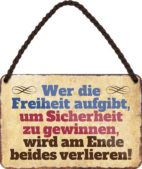 Blechschild ''wer die Freiheit aufgibt um Sicherheit zu gewinnen'' 18x12cm
