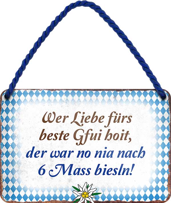 Das Blechschild ''wer liebe fürs.. 6 Mass biesln'' ist aus einem qualitativ hochwertigen Blech mit abgerundeten und umgeschlagenen Kanten. Ideal für Liebhaber und Fans von "Dialekt und Kultur" und definitiv ein Hingucker für jedermanns Auge.