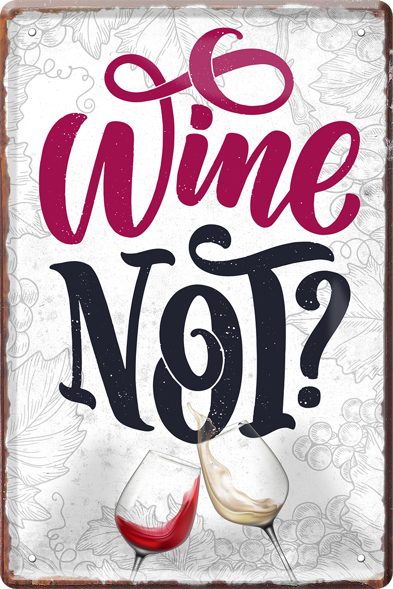 Das Blechschild ''Wine Not'' ist aus einem qualitativ hochwertigen Blech mit abgerundeten und umgeschlagenen Kanten. Ideal für Liebhaber und Fans von "alkoholischen Getränken" und definitiv ein Hingucker für jedermanns Auge.