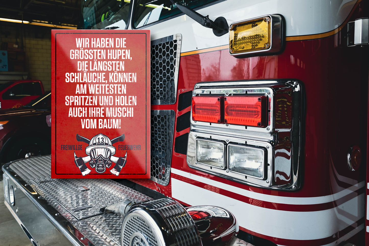 Das Blechschild ''Wir haben die größten Hupen, längsten Schläuche.. Feuerwehr'' ist aus einem qualitativ hochwertigen Blech mit abgerundeten und umgeschlagenen Kanten. Ideal für Liebhaber und Fans von ''Helden gegen das Feuer'' und definitiv ein Hingucker für jedermanns Auge.