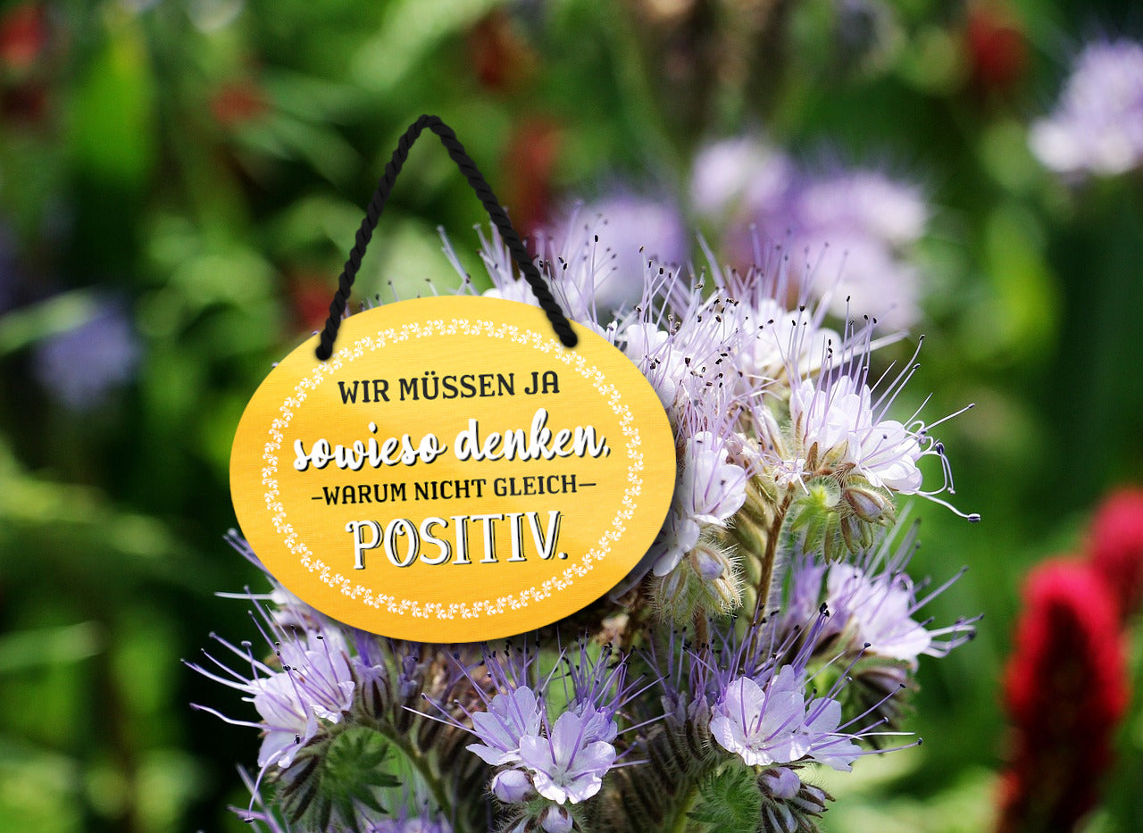 Blechschild ''Wir müssen ja sowieso denken, warum nicht gleich Positiv'' 18x14cm