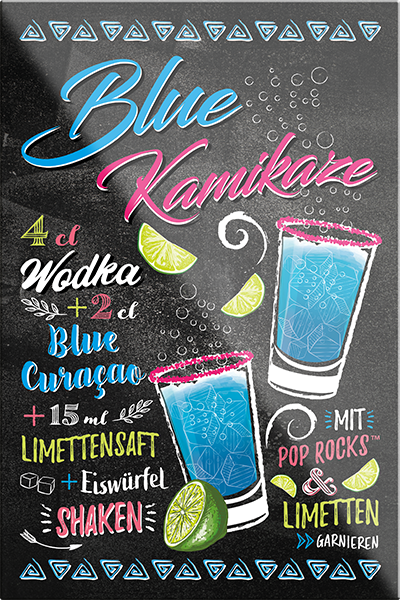 Der Super-Magnet  ''Blue Kamikaze'' ist aus einem langlebigen Metall mit qualitativ hochwertiger Oberfläche. Ideal für Liebhaber und Fans von "alkoholischen Getränken" und definitiv ein Hingucker für jedermanns Auge.