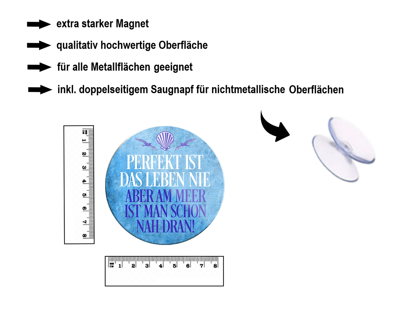 Der Super-Magnet ''Perfekt ist das Leben nie am Meer nah dran'' ist aus einem langlebigen Metall mit qualitativ hochwertiger Oberfläche. Ideal für Liebhaber und Fans von ''frischer Meeresluft und Stränden'' und definitiv ein Hingucker für jedermanns Auge.